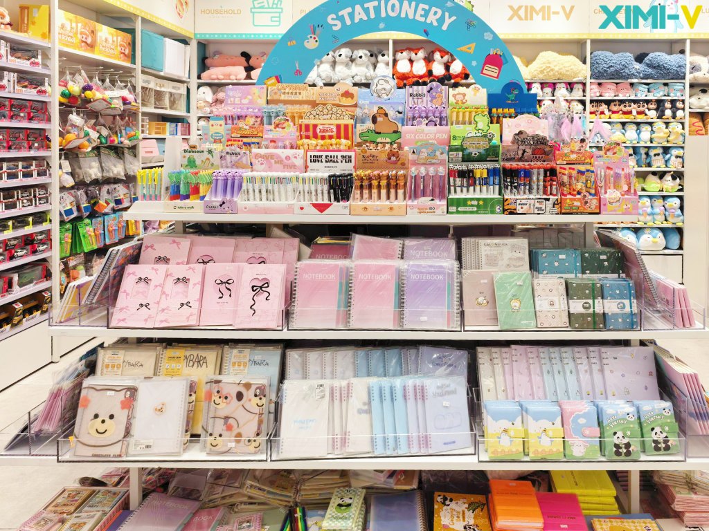 Bright lighting and modern fixtures highlight the brand's signature colorful displays, where products are arranged thematically—from sparkling jewelry sections to cozy corners for home decor and plush dolls.